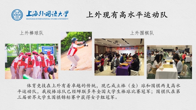上海外国语大学是新中国最早开展对外交流的高校之一。长期以来,我校充分利用语言、地域和学科优势,加强国际间的体育文化交流。在双边关系、学术交流、体育比赛等方面取得了一定的成绩。我校现已成立棒球、围棋两支高水平运动队。在日本东京世界学生王座赛、第三届世界大学生围棋锦标赛、中国大学生棒球锦标赛、中国大学生棒垒球联赛等海内外高端竞赛中屡获佳绩。