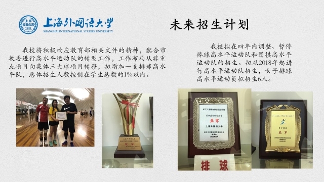 招收运动员:按教育部要求,招收二级以上的运动员。考虑到我校外语学习的特点,招收对象以全国高中应届毕业生为主,经过我校的文化与体育加试,择优录取。从2018年开始计划拟招收6名排球高水平运动员,拟在四年内在编排球运动员扩充到20名左右。