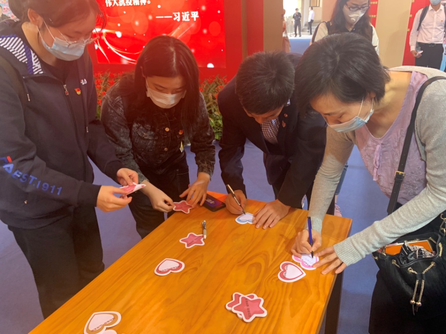 参观的最后,许多党员教师和学生在留言板上写下观展感想和对城市的祝福:因为有你,山河无恙;因为有你,城市有光!