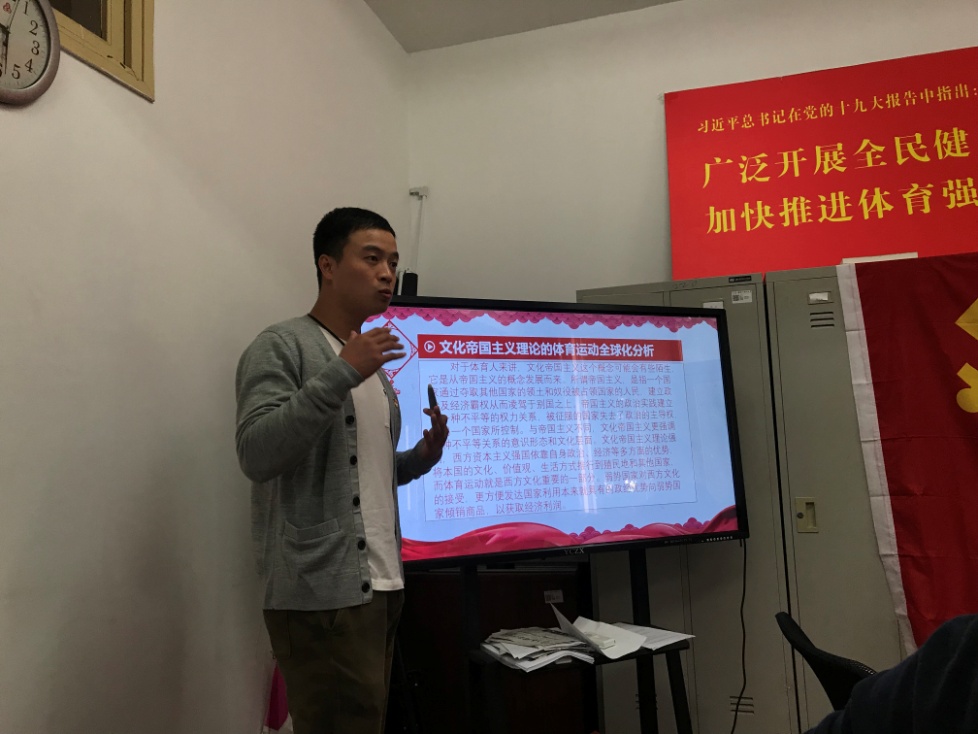 会上,何宁宁老师以《文化帝国主义视角下现代体育运动传播与全球化》为题,从传播学和全球化视角分别就体育文化和价值观传播进行了深入浅出的分析,以全新的视角与党员教师进行探讨和分享,大家纷纷表示要坚定“四个自信”,大力弘扬优秀传统体育项目,从体育项目中讲好中国故事,发出中国声音。