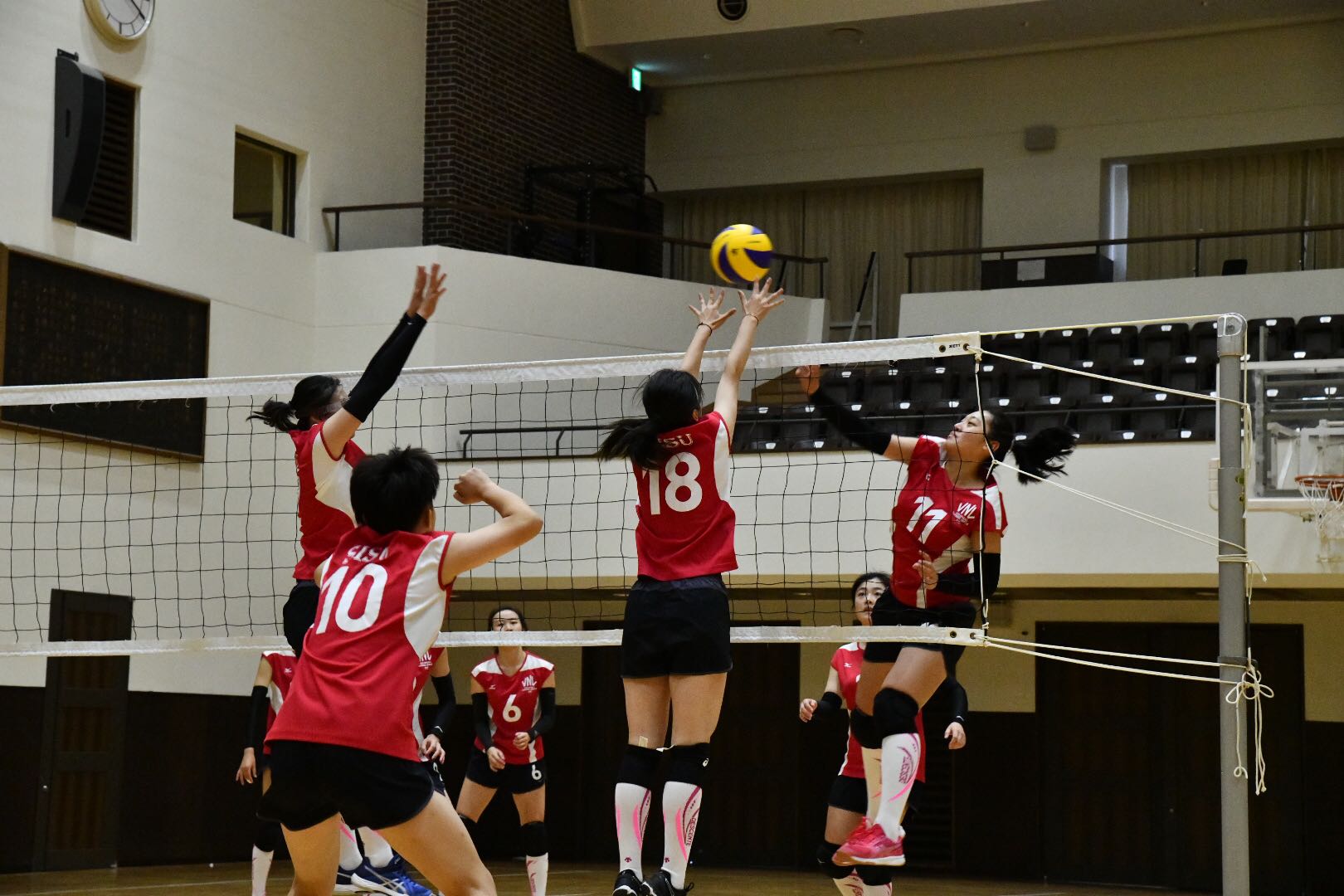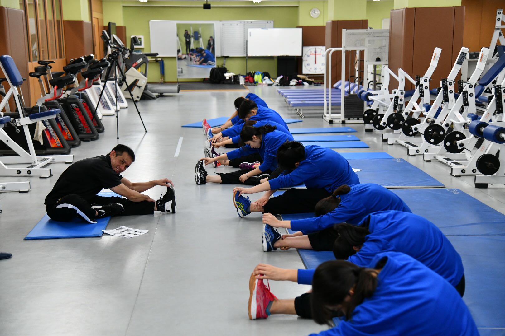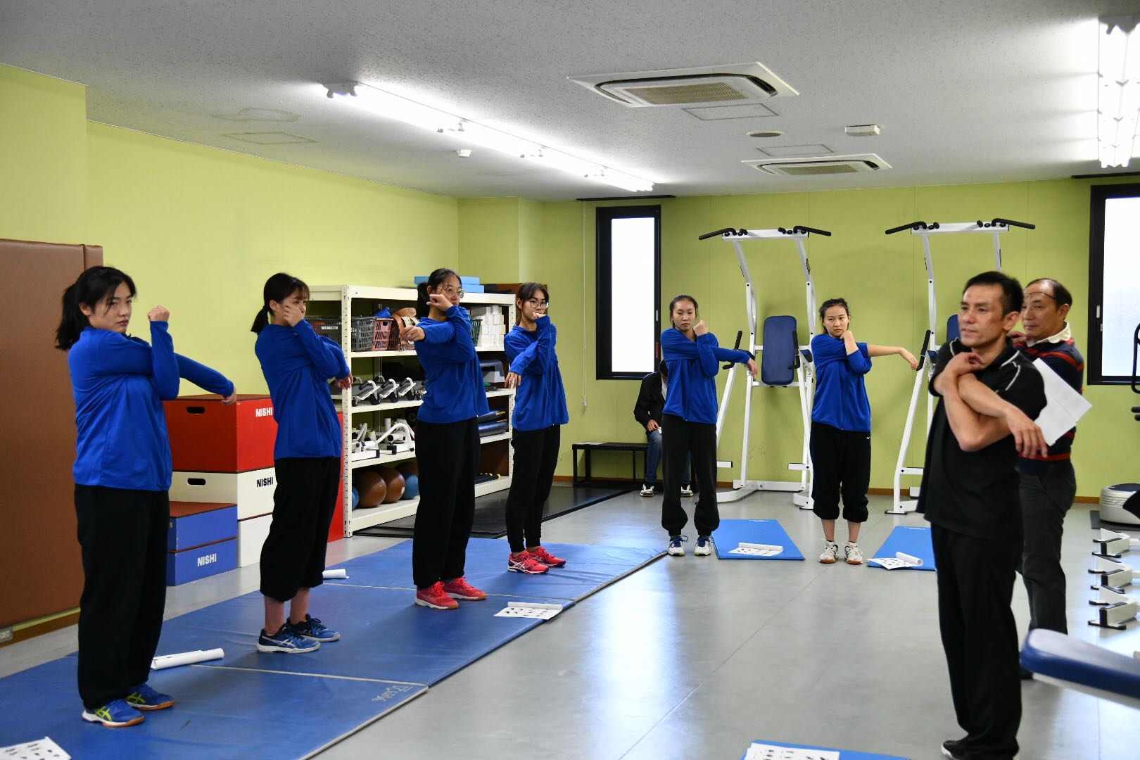 之后前往大阪产业大学体育健康学部,由学院老师现场指导队伍体适能训练,准备活动与整理拉伸。下午前往帝塚山大学,同帝塚山大学女子排球队共同训练,并与同帝塚山大学女子排球队共同训练并进行友谊比赛。访问期间球队前往京都大学参观校园、学习校园文化。
