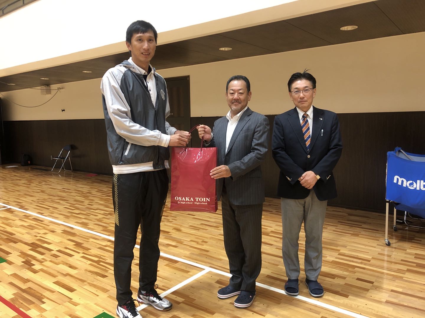 球队大阪桐荫高中体育馆进行训练。中午在大阪产业大学国际交流中心与大阪产业大学校长会面,进行友好交流并合影留念。下午与产大男女排共同训练、比赛。晚上与产大男女排通过便当会,相互交流学习。