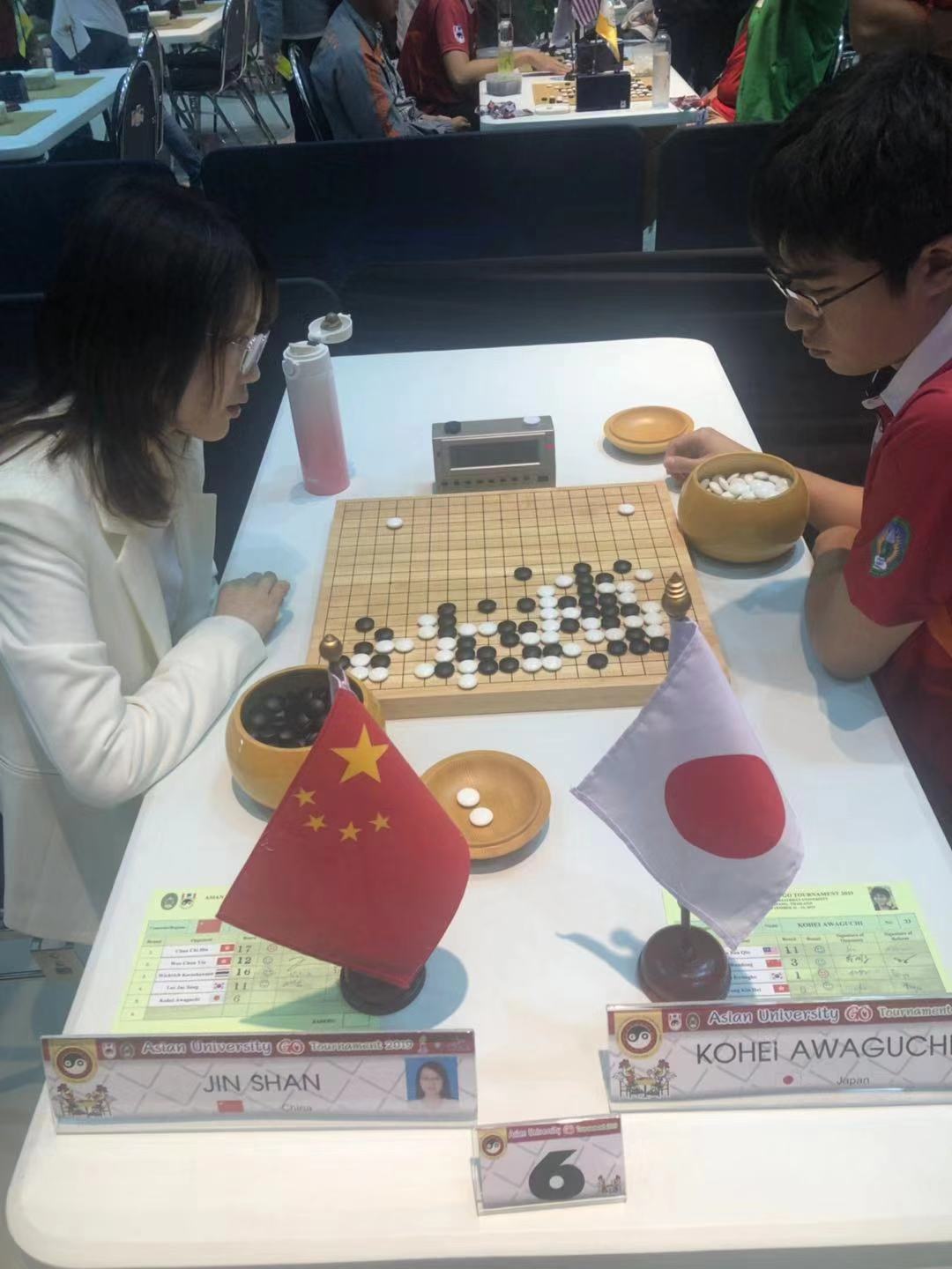 比赛采用应氏围棋规则,参赛选手分为A-E组四个组别,每个组分别进行6轮循环赛。其中,作为赛事水平最高的A组,预赛结束后进行半决赛和决赛。代表我校参赛,来自日本文化经济学院的贺桑蓬6段发挥出色,面对世界各国最强的大学生棋手奋勇拼搏,以5胜1负预赛第四的成绩成功闯入半决赛。在11日上午进行的半决赛中,面对卫冕冠军预赛排名第一的韩国棋手白云起7段,布局阶段双方互围大模样,执黑的贺桑蓬实地优势明显,可惜进入中盘后作战操之过急,被对手抓住失误遗憾落败,最终名列殿军。来自国际工商管理学院的程时骄7段同样发挥出色,最终总成绩4胜2负获得第六名。