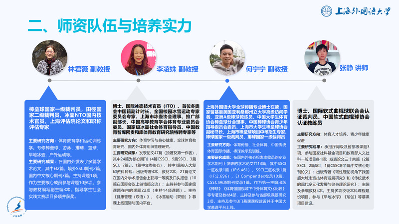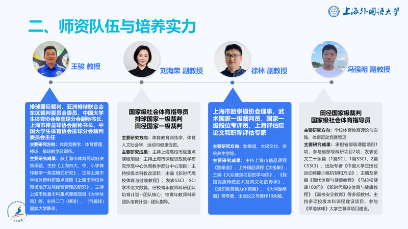 1、王骏:1970年10月出生,教授,中共党员,体育硕士,上海外国语大学体育教学部主任。2012年获上海市育才奖,2016年获教育宝钢奖(优秀教师),硕士生导师,国际级排球裁判。现任全国大学生棒垒球协会副秘书长、上海市棒垒球协会副秘书长,上海市大学生棋牌协会秘书长,上海市大学生排球协会副主席,裁判委员会主任。2014年获国家教育部留学基金委指派赴加拿大阿尔伯特大学担任高访学者,2016年获教育部体育高级管理人员海外研修项目,赴美国圣母大学研修。曾担任2008年奥运会、2010、2018年亚运会、2011年、2013年、2015年、2019年世界大学生运动会排球项目国际技术官员,赴泰国、日本、印尼、伊朗、瑞士、捷克、意大利、俄罗斯等国家参加了亚洲排球俱乐部冠军赛和其他世界赛事。第十、十一、十二、十三届届全国运动会排球项目的裁判,第十三届中国大学生运动会排球项目总裁判长,被国家教育部和国家体育总局评为排球优秀裁判。专项及专修:体育竞赛学、体育管理、棒球、排球教学及训练,主要教授课程:棒球、体育欣赏、体育管理。担任棒球高水平运动队教练,率上海外国语大学高水平棒球队勇夺2001--2019年上海市高校棒球联赛冠军,取得了十九连冠的辉煌战绩,2011、2012、2015、2018年夺得全国大学生棒球联赛的总冠军。2015年起获上海市体育局政府决策课题,主持《上海市大、中、小学棒球教学一条龙模式研究》,主持上海市学校体育科研重点课题《上海市学校体育场地开发与经营管理的研究》,主持上海市教委本科重点课程项目《大学体育》。目前受聘于国际排球联合会排球国际级裁判(瑞士洛桑)。