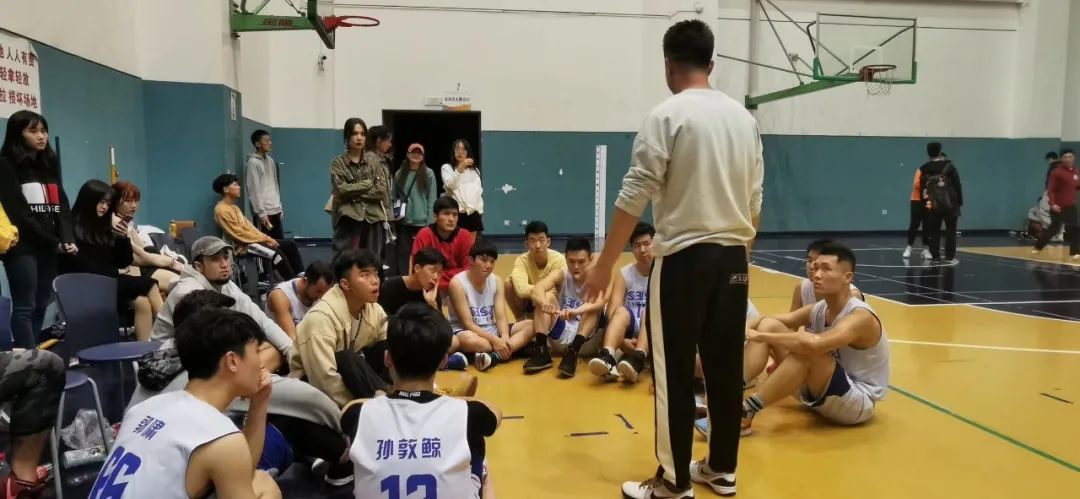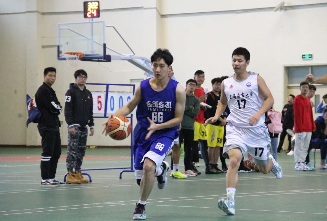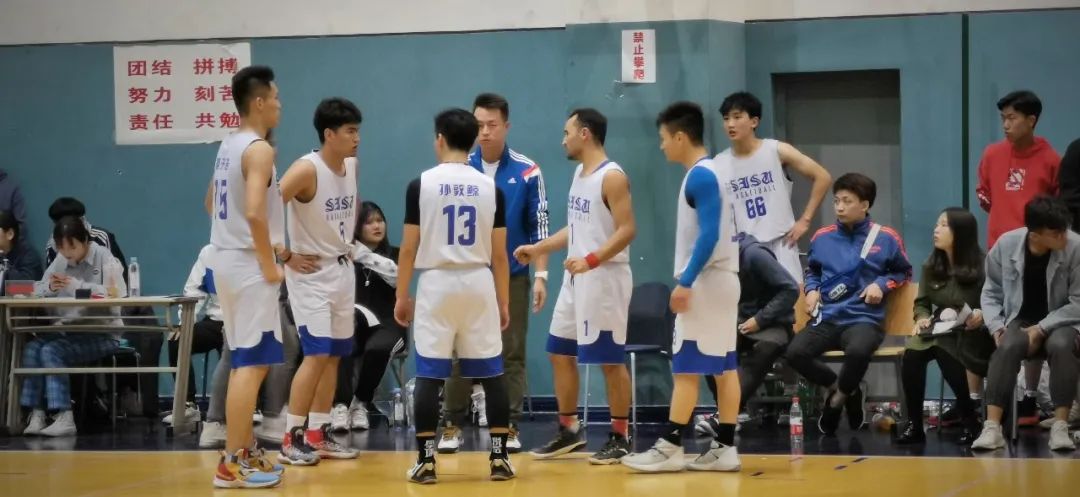 2019年12月1日,冷气包裹着松江。但上海立信会计金融学院体育馆里,上外男篮的球员们早就脱下了厚重的外套,穿着印着大大SISU的蓝白球衣,提前两个小时开始了热身与备战。这一天要进行上海市大学生篮球联赛16进8的淘汰赛,对手是上海纽约大学。