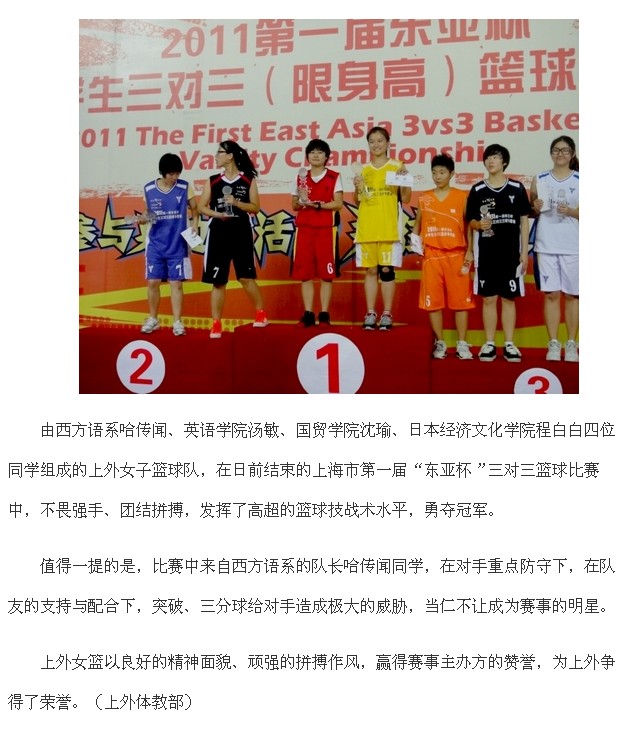 上外女篮队荣获2011上海市第一届“东亚杯”三对三篮球赛冠军(图)