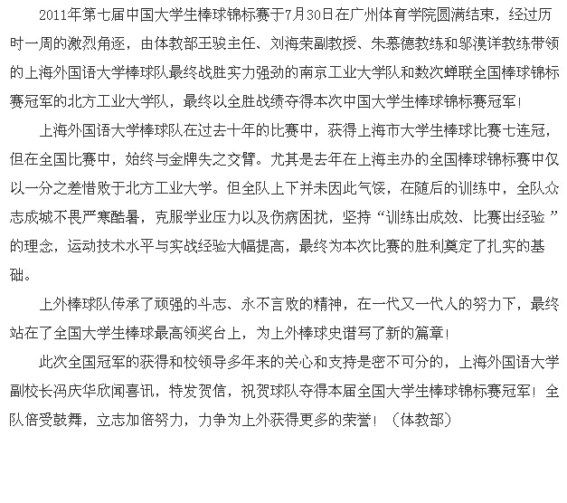 上外棒球队荣获中国大学生棒球锦标赛冠军