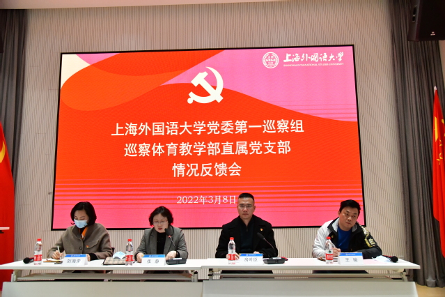 根据校党委统一部署,近日,上海外国语大学党委第一巡察组向体育教学部直属党支部反馈巡察情况。2022年1月21日,上海外国语大学党委第一巡察组组长房叶臣向体教部直属党支部书记刘海荣、主任王骏进行个别反馈,会上校党委副书记、纪委书记、巡察工作领导小组副组长钱玲传达校党委指示精神并开展全面从严治党工作谈话。2022年3月8日,房叶臣代表上海外国语大学党委第一巡察组进行大会反馈。联系校领导张静副校长传达校党委指示精神并对巡察整改工作提出要求。刘海荣作表态发言。王骏主持会议。