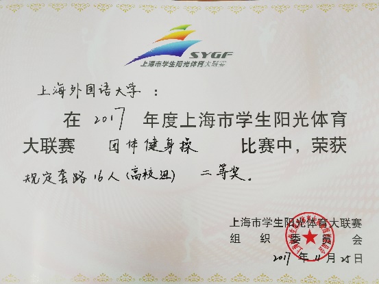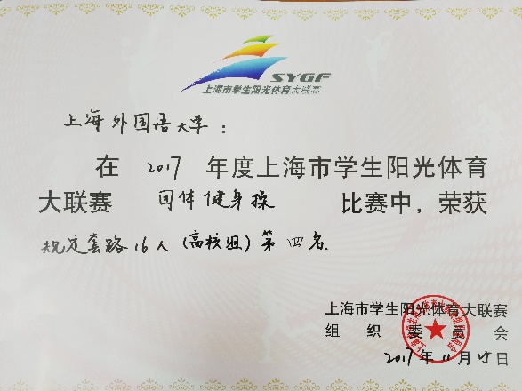 近日,我校健美操队参加了由上海市教育委员会、上海市体育局和共青团上海市委员会主办,由上海市学生活动管理中心、上海市青少年训练管理中心和同济大学承办的2017年度上海市学生阳光体育大联赛团体健身操比赛,我校健美操队在领队刘海荣老师、教练李凌姝老师的带领下荣获第四名,二等奖。
