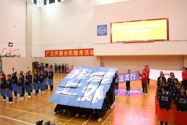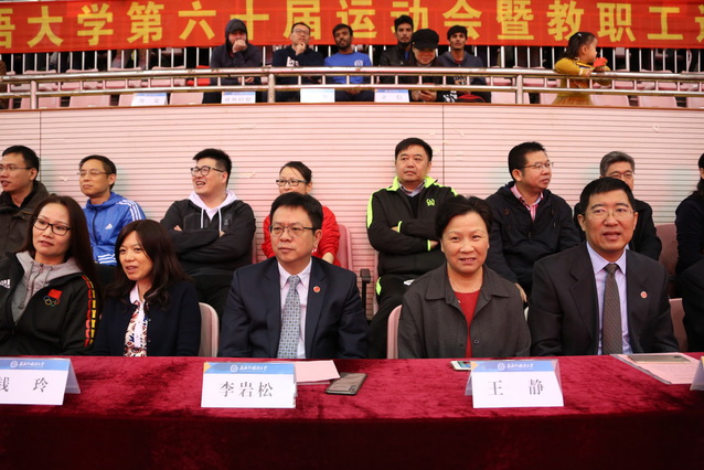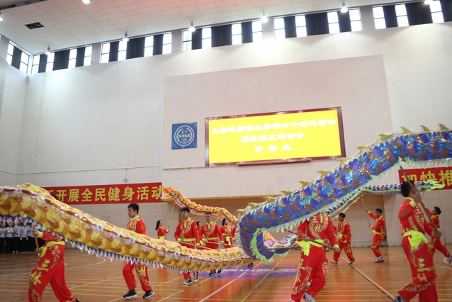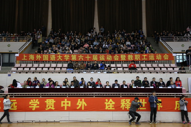2018年11月8日,上海外国语大学第六十届校运会暨教职工运动会在松江校区师生活动中心顺利开幕。校长李岩松、校党委副书记王静、校党委副书记钱玲、副校长杨力等校领导、学校各职能部门、各院系领导以及松江大学园区各高校体育部主任和上外师生共同出席了本届运动会开幕式,开幕式由体育教学部主任王骏主持。