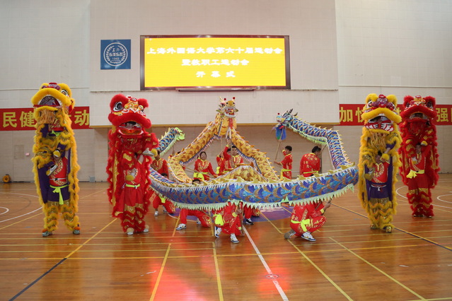 17个院系代表队的方阵依次入场,带着各具特色的表演纷纷通过主席台,向校领导展示院系的风采和积极的体育面貌。校运会的文体展示环节,率先登场的是由我校学生为代表的舞龙舞狮表演。我校积极响应国家“传统文化进高校”的号召,舞龙队的成立和舞龙课程的开设已将近2年时间,去年校运会初次亮相在全校师生面前进行表演,给师生带来全新的开幕式体验。本次校运会展示增加舞狮表演,配以京锣、鼓钹伴奏,两条舞龙时缓时急,蜿蜒翻腾,熠熠生辉;四只舞狮成双成对,表演腾翻、扑跌、跳跃、登高等技巧,生动形象、惟妙惟肖,在弘扬传统文化的同时,给师生带来一场视听盛宴,振奋人心,为运动员加油助威。狮子嘴中吐出两个彩头“弘扬爱国奋斗精神,建功立业新时代”、“享受乐趣、增强体质,健全人格、锤炼意志”,寓意在党中央领导的中国特色社会主义新时代积极贯彻习近平总书记系列讲话精神,大力发展体育强国建设,发挥体育育人功能,增强学生身体素质,培养学生的团队合作精神,为助推学校“双一流”建设服务。舞龙舞狮表演之后,进行传统的广播操和啦啦操表演。广播操以英语学院、德语系和西方语系三支学生队伍为代表,年轻的脸庞,标准的动作,迸发青春的活力;啦啦操以国际工商管理学院、国际金融贸易学院和东方语学院三支学生队伍为代表,旋转飞舞的彩虹伞为啦啦操增添了绚丽的色彩,优美的舞姿展现上外学生的多姿多彩。